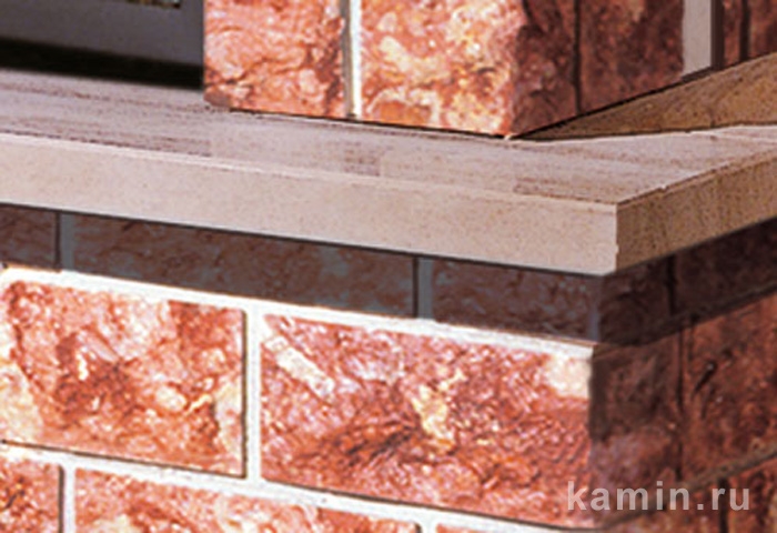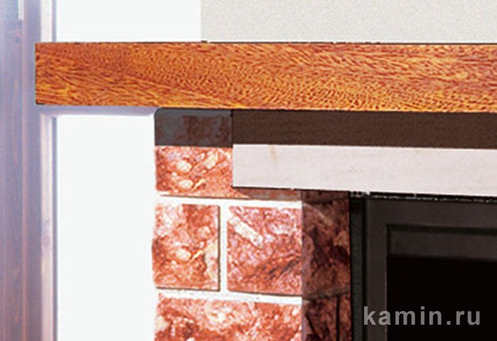 Пристенная облицовка из красного мрамора грубой обработки на цементной основе, плита и надтопочная деталь из светлого полированного мрамора, балка деревянная, массив.