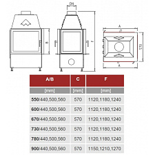 Стальная каминная топка с прямым стеклом. Подъёмная дверца (Система Easy-Lift). Горизонтальное открывание двери для чистки стекла. Ширина дверки 656 мм. Высота дверки 548 мм. Возможно подключение воздуха извне.